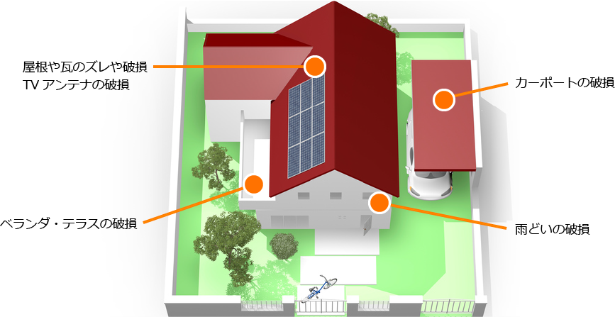 ご相談の多い代表的な修理が下記の4か所(瓦・屋根のズレや破損 / テラスの破損 / カーポートの破損 / 雨どいの破損)です。